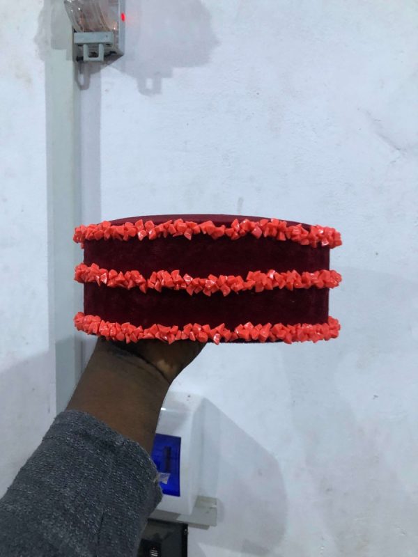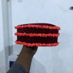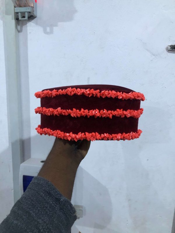This is a customised burgundy color kufi round cap adorned with broken coral beads which makes the cap spectacular and unique. If you are looking for a special cap that would make you standout on your wedding day, then get this.